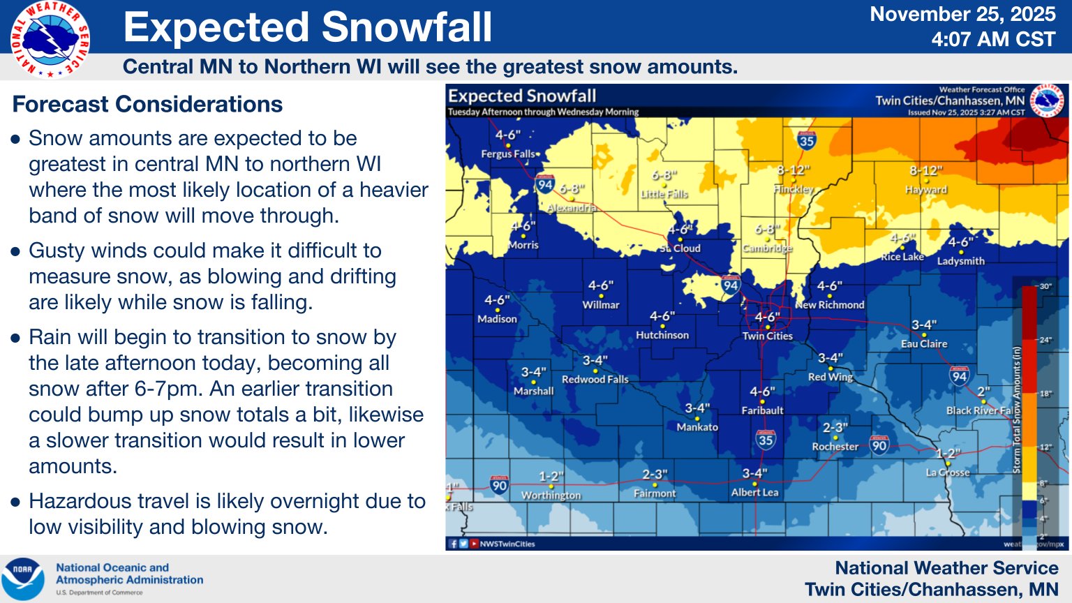 URGENT - WINTER WEATHER MESSAGE National Weather Service Twin Cities/Chanhassen MN 625 AM CST Tue Nov 25 2025 ...RAIN WILL TURN TO HEAVY SNOW FROM WEST TO EAST THIS AFTERNOON AND TONIGHT... ...SNOWFALL RATES EXCEEDING AN INCH PER HOUR AND STRONG NORTHWEST WINDS GUSTING TO 45 MPH MAY LEAD TO BLIZZARD CONDITIONS AT TIMES... .A potent storm system will move across the area today and tonight. Rain will transition snow from west to east as cold air arrives. Periods of heavy snow are expected with rates of around an inch per hour at times. The heaviest totals will be found across central Minnesota and northwest Wisconsin where around 6 inches are expected. Farther south across southern Minnesota and parts of west central Wisconsin, 1 to 3 inches are expected. Winds will increase later today and tonight with gusts as high as 45 mph. Combined with the falling snow, widespread blowing snow and blizzard conditions are possible at times with visibilities 1/4 mile or less. The Winter Storm